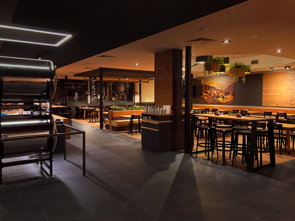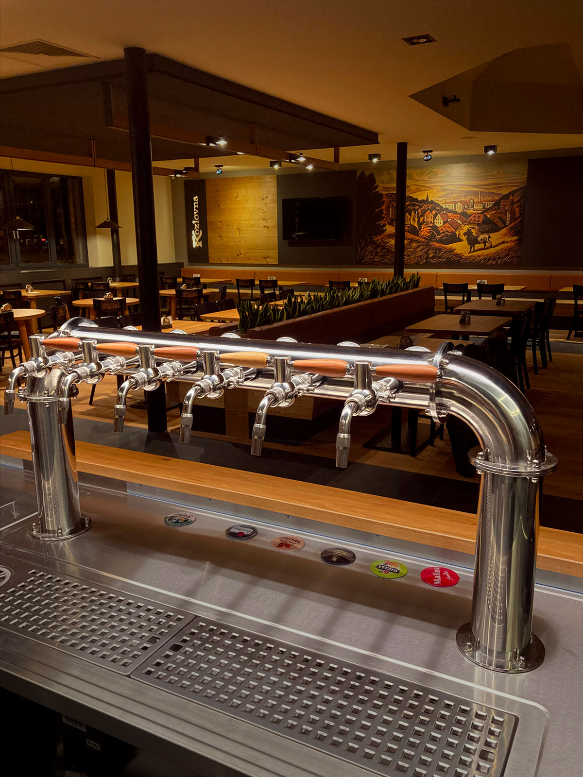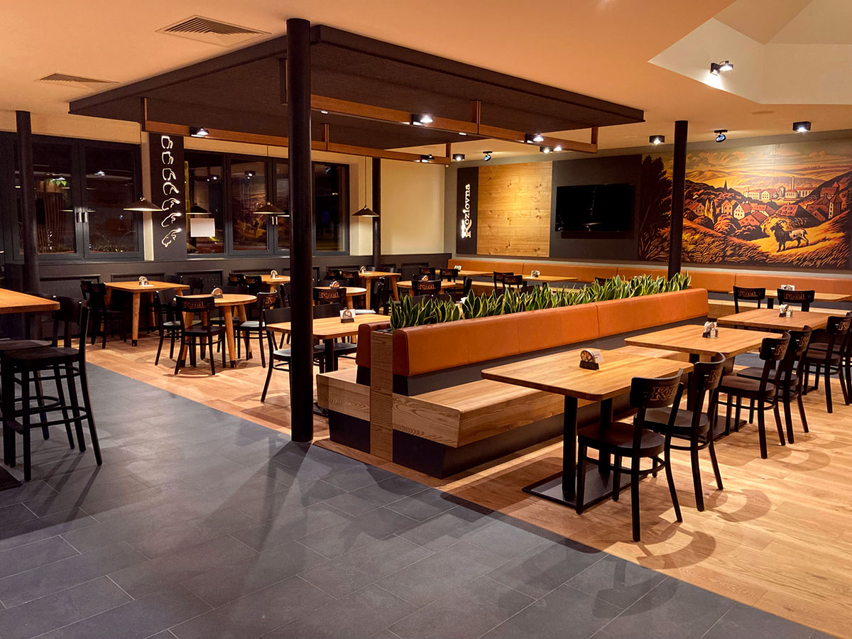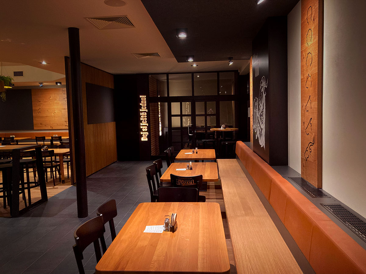 Majestátní socha Kozla, netradiční stoly s kovovými kopýtky nebo další detaily, které Vás osloví. Všechny tyto elementy ve spojení s materiály dřeva, kůže i kovu navozují příjemnou a nezapomenutelnou atmosféru každé Kozlovny.